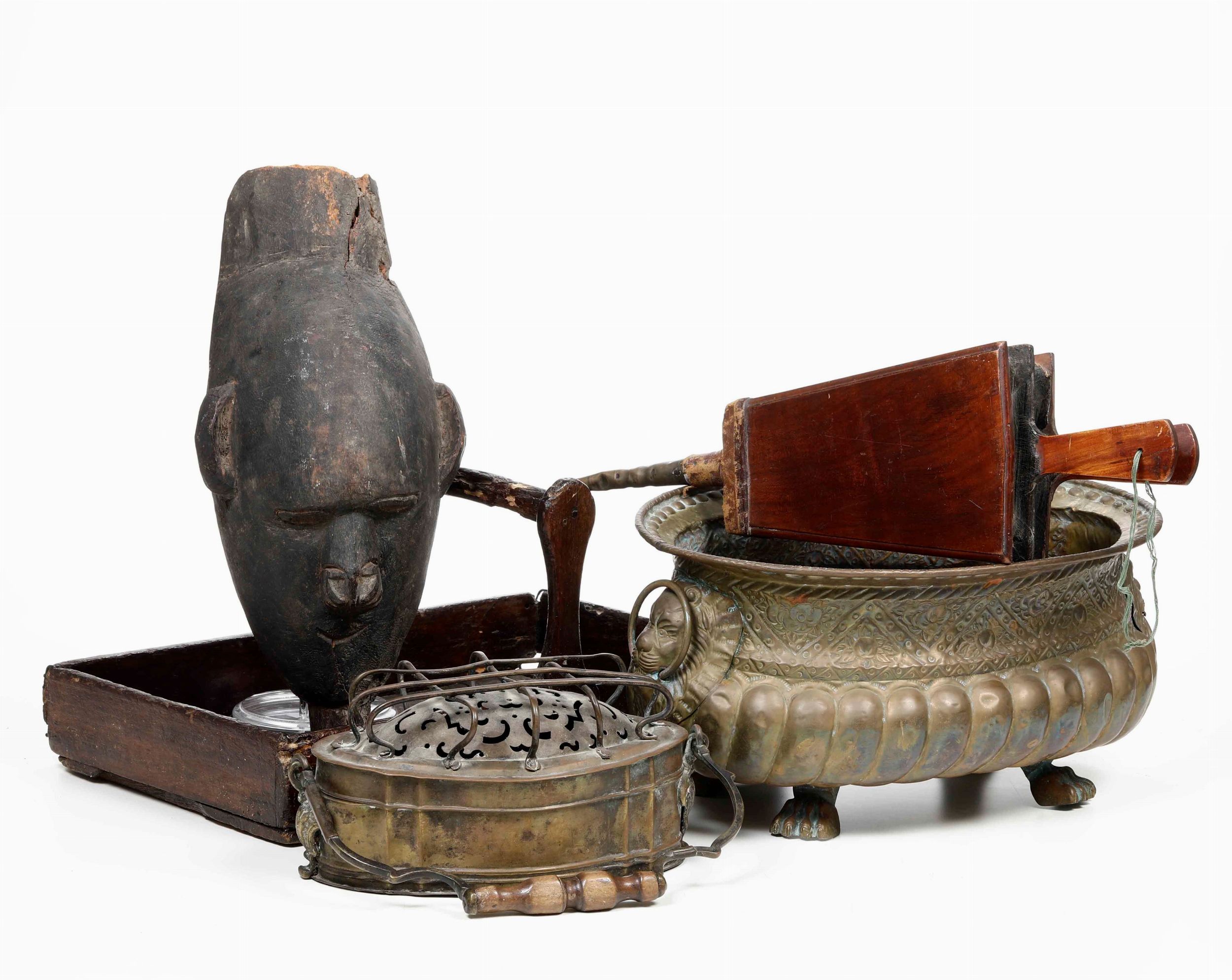 composto da bacile e scaldino in rame, maschera africana, soffietto e porta utensili in legno