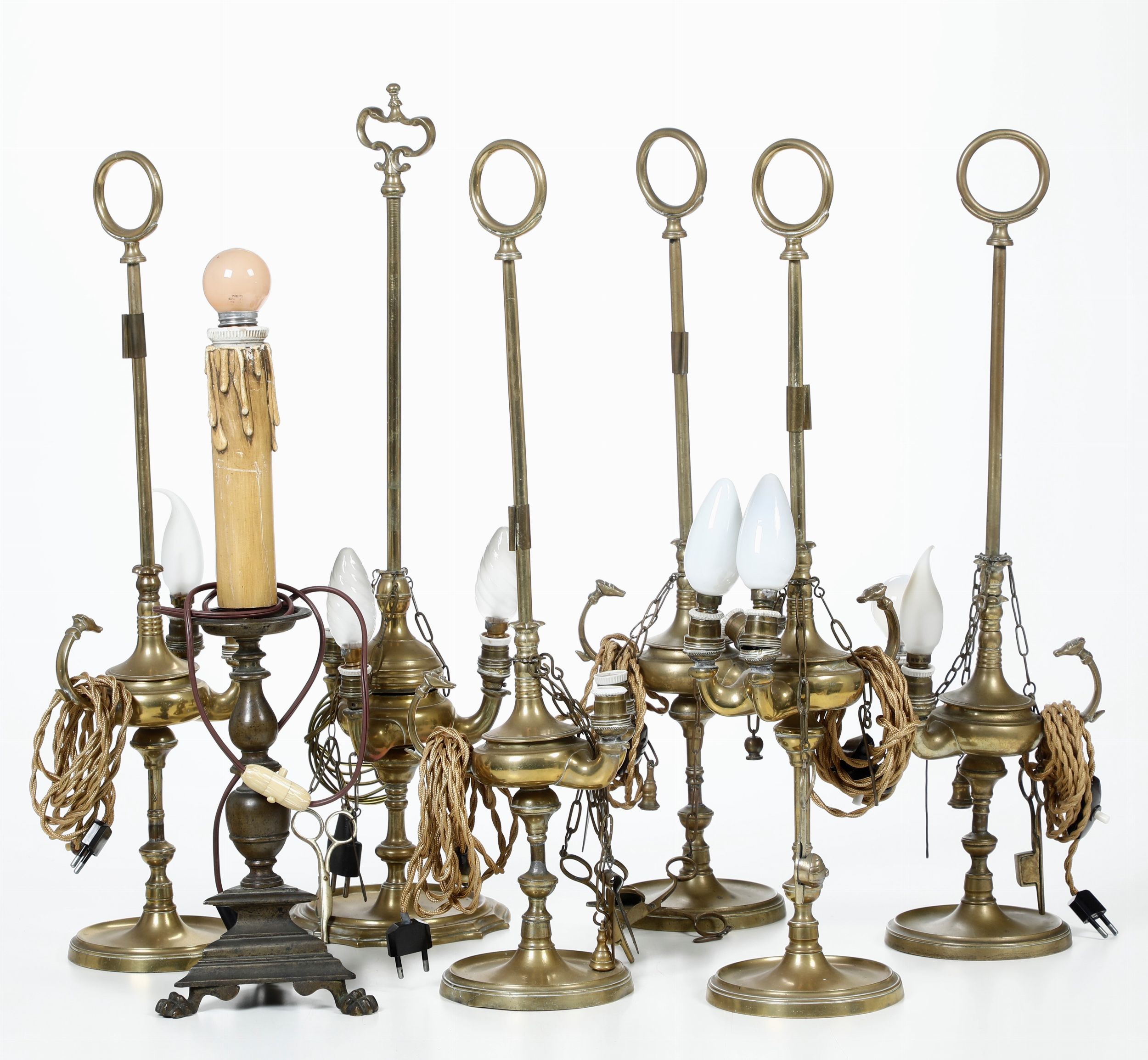 Lotto di sei lucerne fiorentine e un candeliere