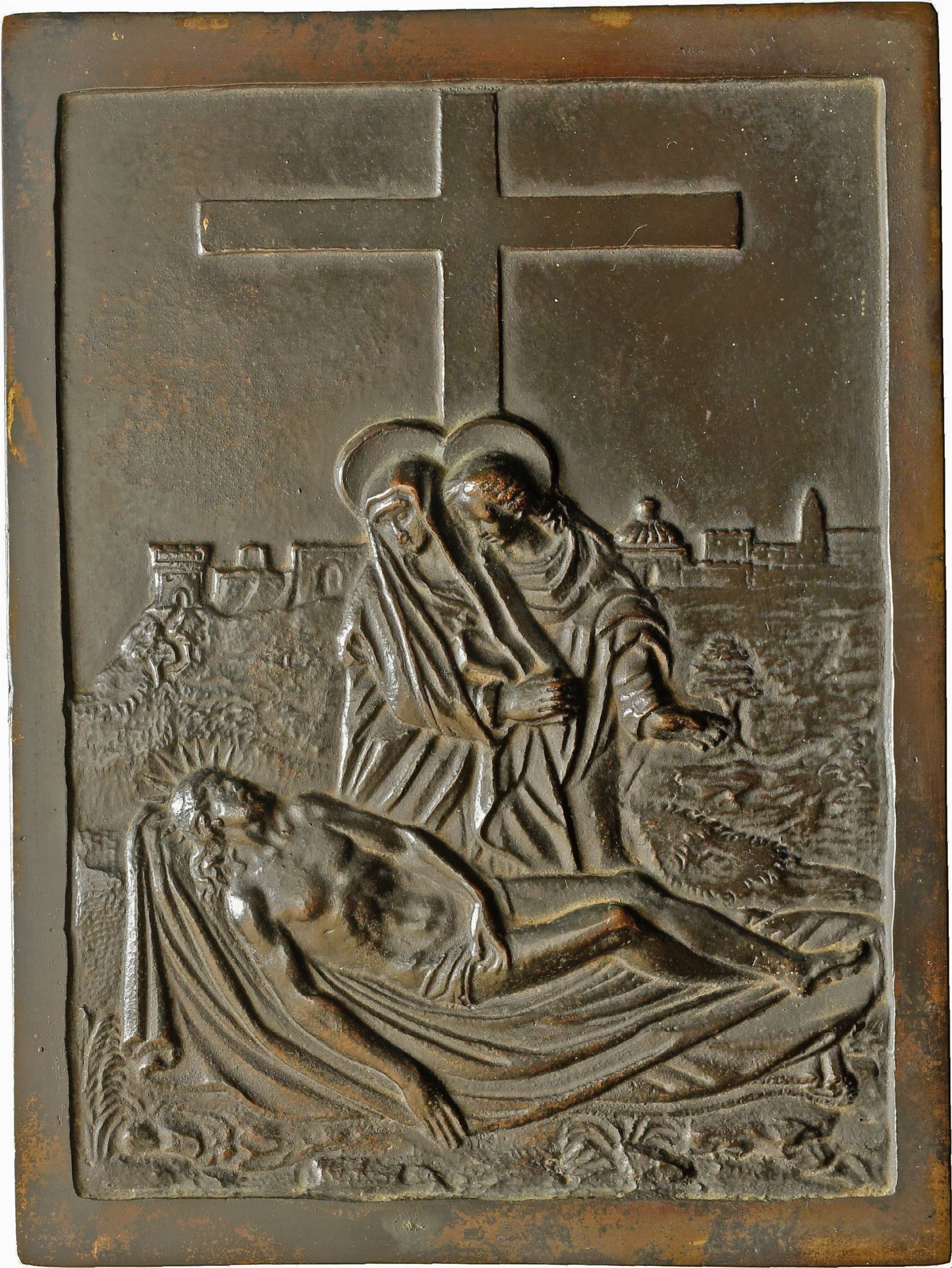 In primo piano il Cristo disteso sopra il sudario con aureola raggiante, la Vergine con San Giovanni Battista guardano dolenti il corpo. Dietro grande croce s sullo sfondo la città di Gerusalemme. Grande cornice liscia. Bellissima fusione posteriore.