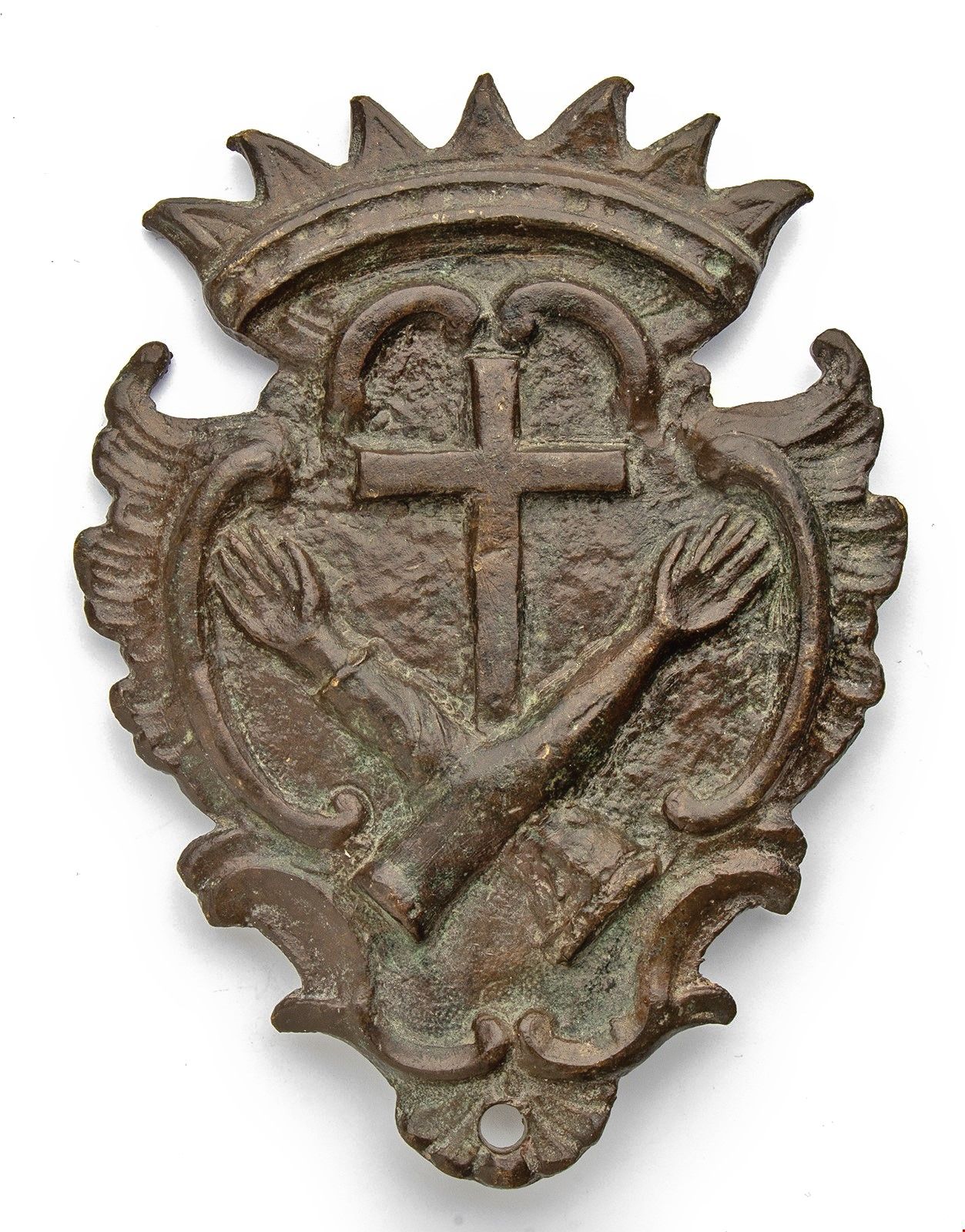 Due braccia incrociate, grande croce coronata. Foro di in basso al centro. Fusione antica produzione artigianale