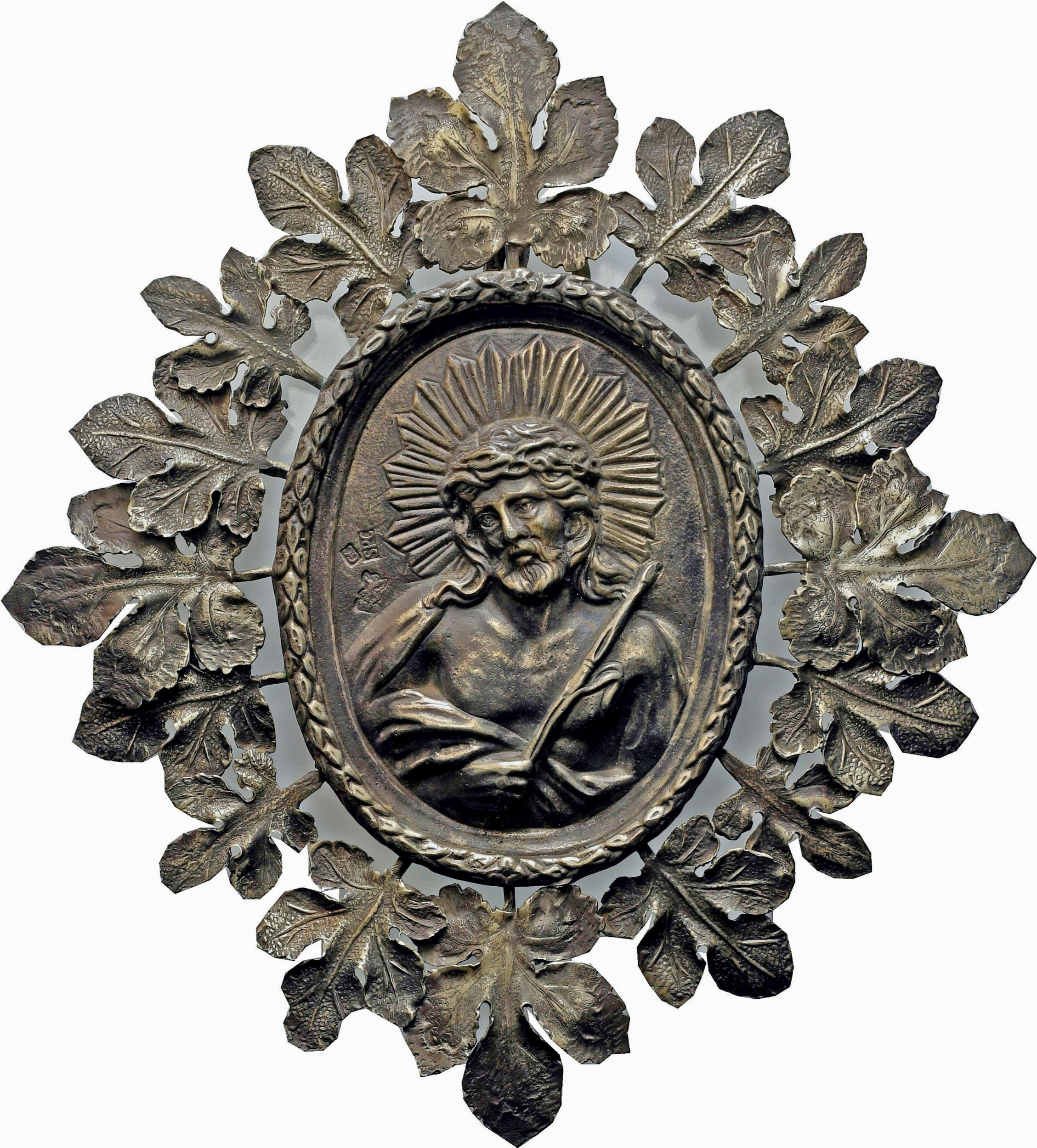 Gesù Cristo a mezza figura, frontale, con corona di spine e canna sul petto; fondo puntinato, contornato da foglie. A sinistra punzoni dell'orafo.