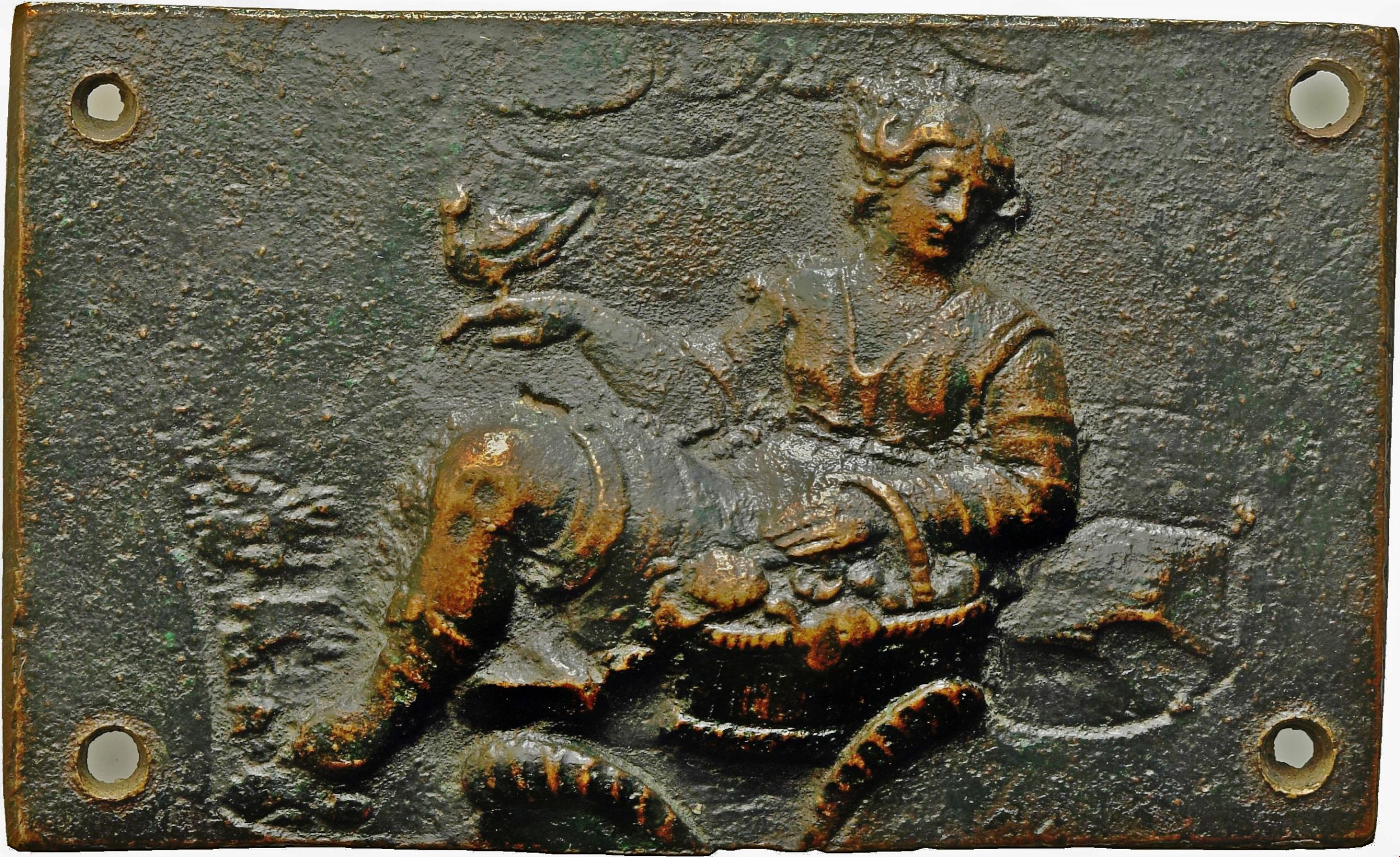 Figura femminile seduta sopra un masso con un uccellino nella mano destra e un cesto di frutta nella sinistra. Sfondo con nuvole. Bella fusione antica