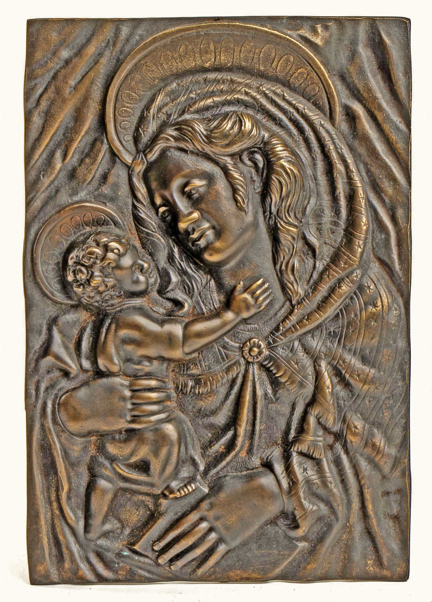 Maria con grande aureola tiene sulle ginocchia il Bambino
