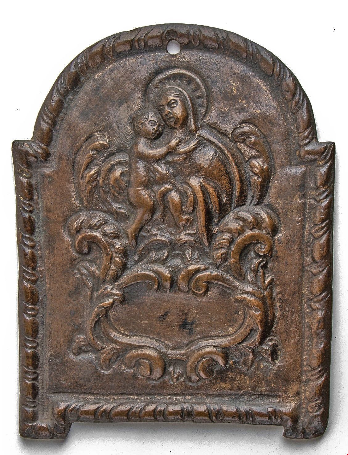 La Madonna a mezza figura con aureola tiene in braccio il Bambino; in basso un cartiglio tra volute. Cornice a torciglioni, fondo liscio. Fusione antica, produzione artigianale.