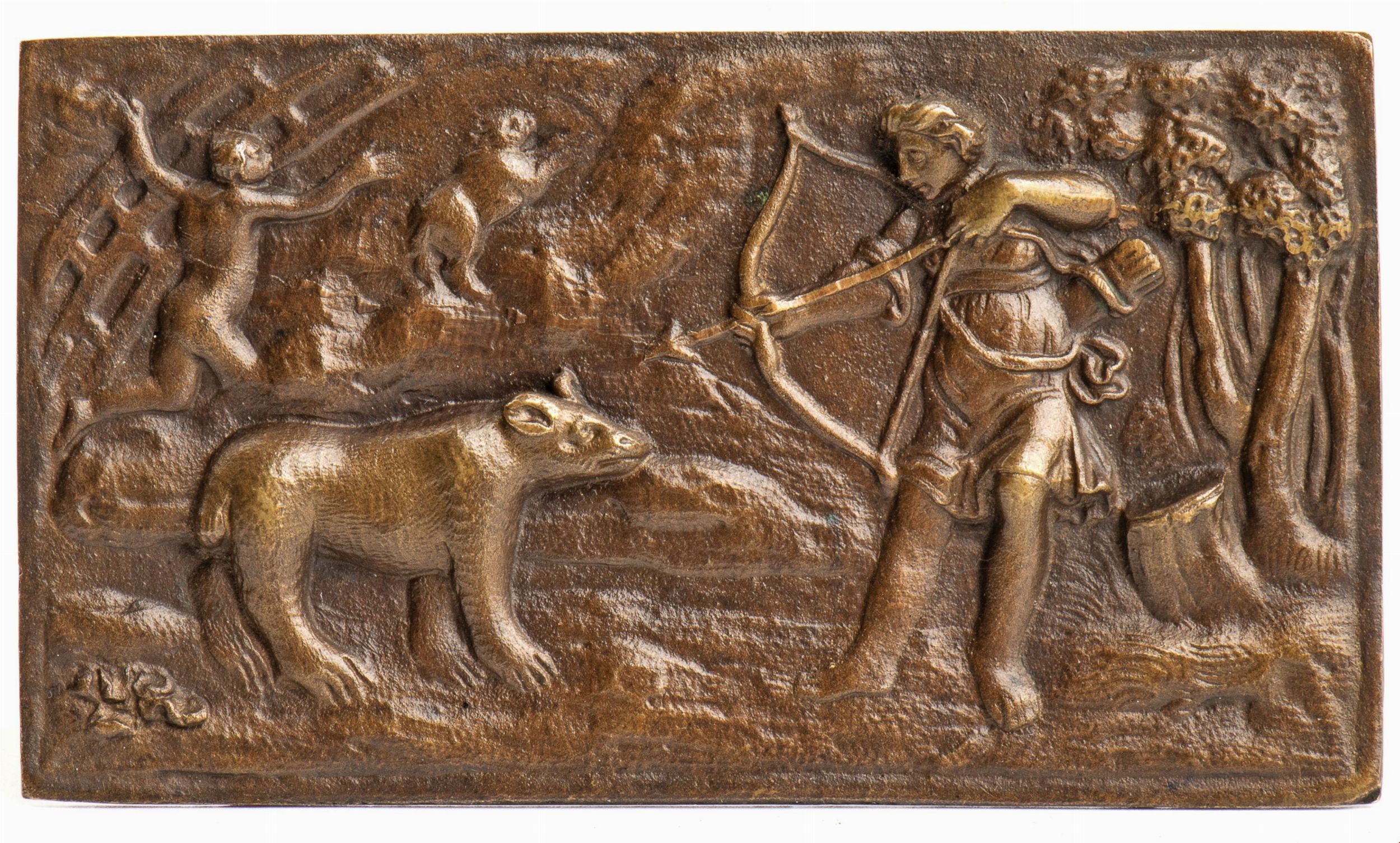Callisto in atto di uccidere Arcade trasformata in orsa; sullo sfondo i due salgono verso il paradiso. Sulla destra fitta boscaglia.
