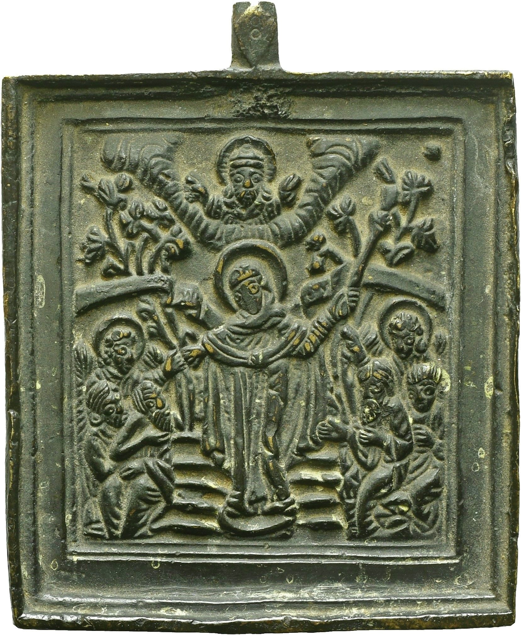 In primo piano la Madonna con aureola e scettro nella mano destra, alla sua sinistra tre figure di cui una con aureola; sulla destra anche qui tre figure di cui una con aureola. Sopra il Padre Eterno