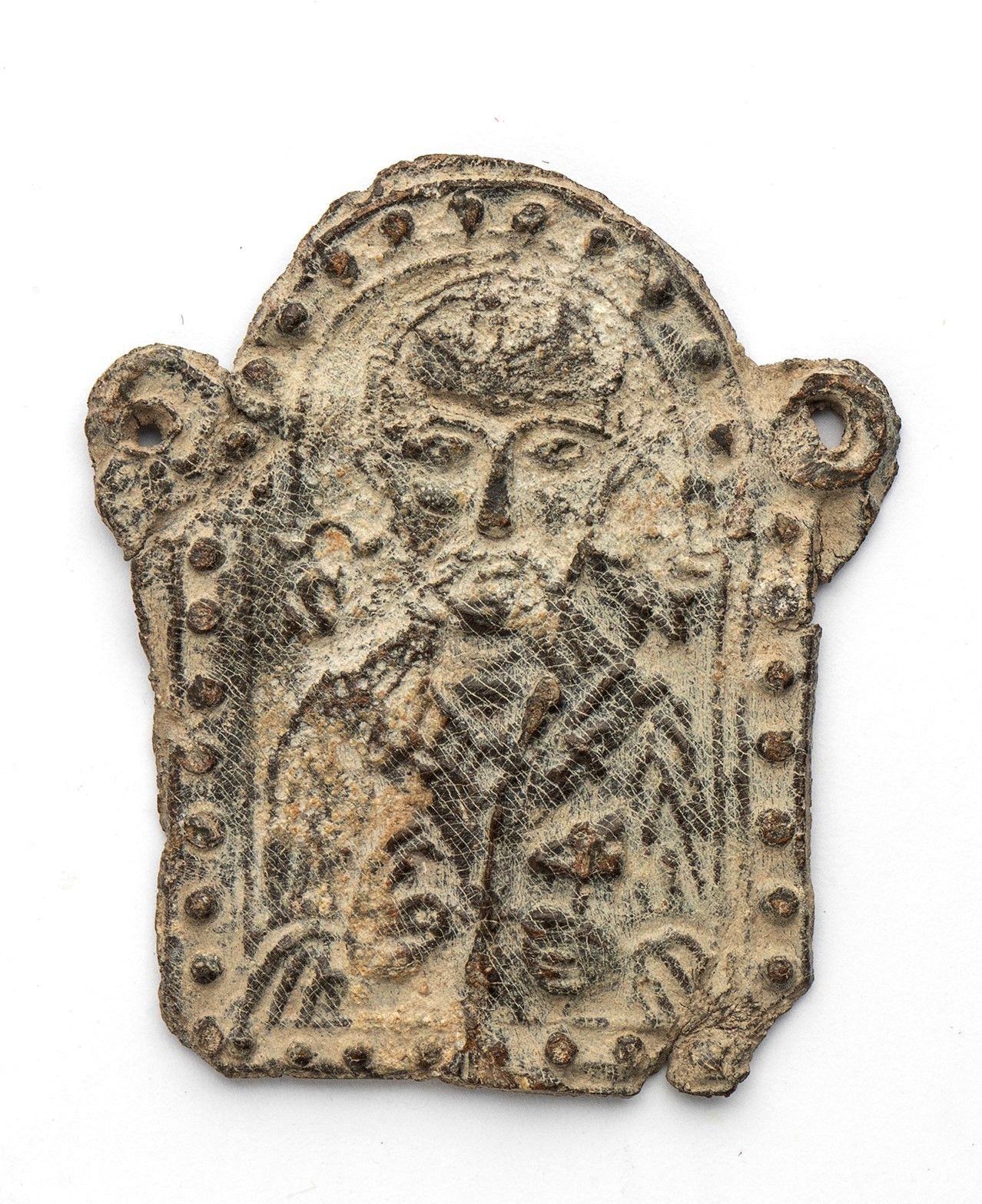 Il tutto dentro un contorno di perline. Due fori laterali indicano che la placchetta veniva cucita su della stoffa.