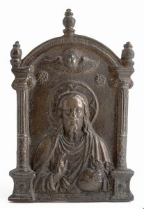 Scuola lombardo-veneta, sec. XV - XVI Pace in bronzo fuso, patina marrone; mm 133,4 x 80,4; gr 207,7. [..]
