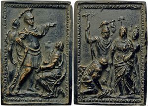 Pace in bronzo fuso con edicola a tempietto sec XVI; fusione tarda mm 112,2 x 72,8; gr 126,7. [..]