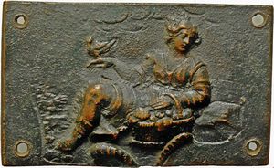Ae fuso rettangolare, mm 108,3 x 95,3; gr 370,5; patina marrone con tracce di doratura. La Fede, sdraiata [..]