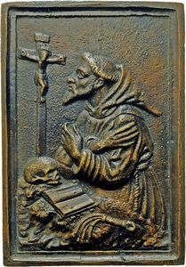 Spagna?, sec. XVII Ae fuso; patina scura; mm 94,3 x 66,2; gr 150,5 San Francesco inginocchiato [..]