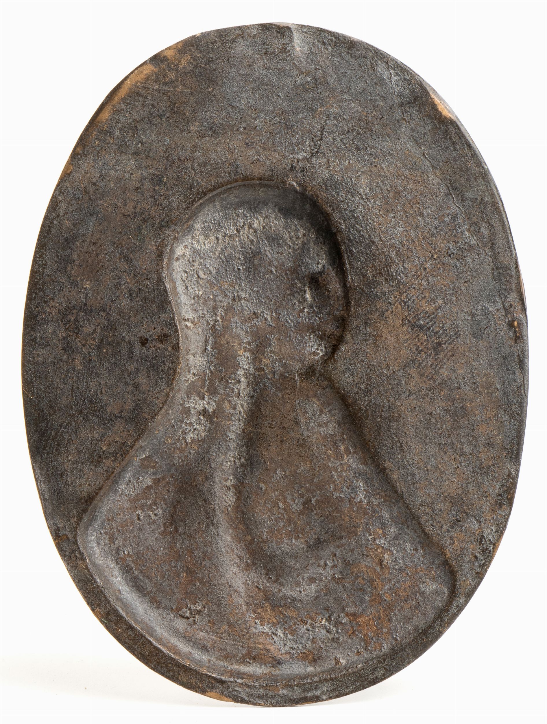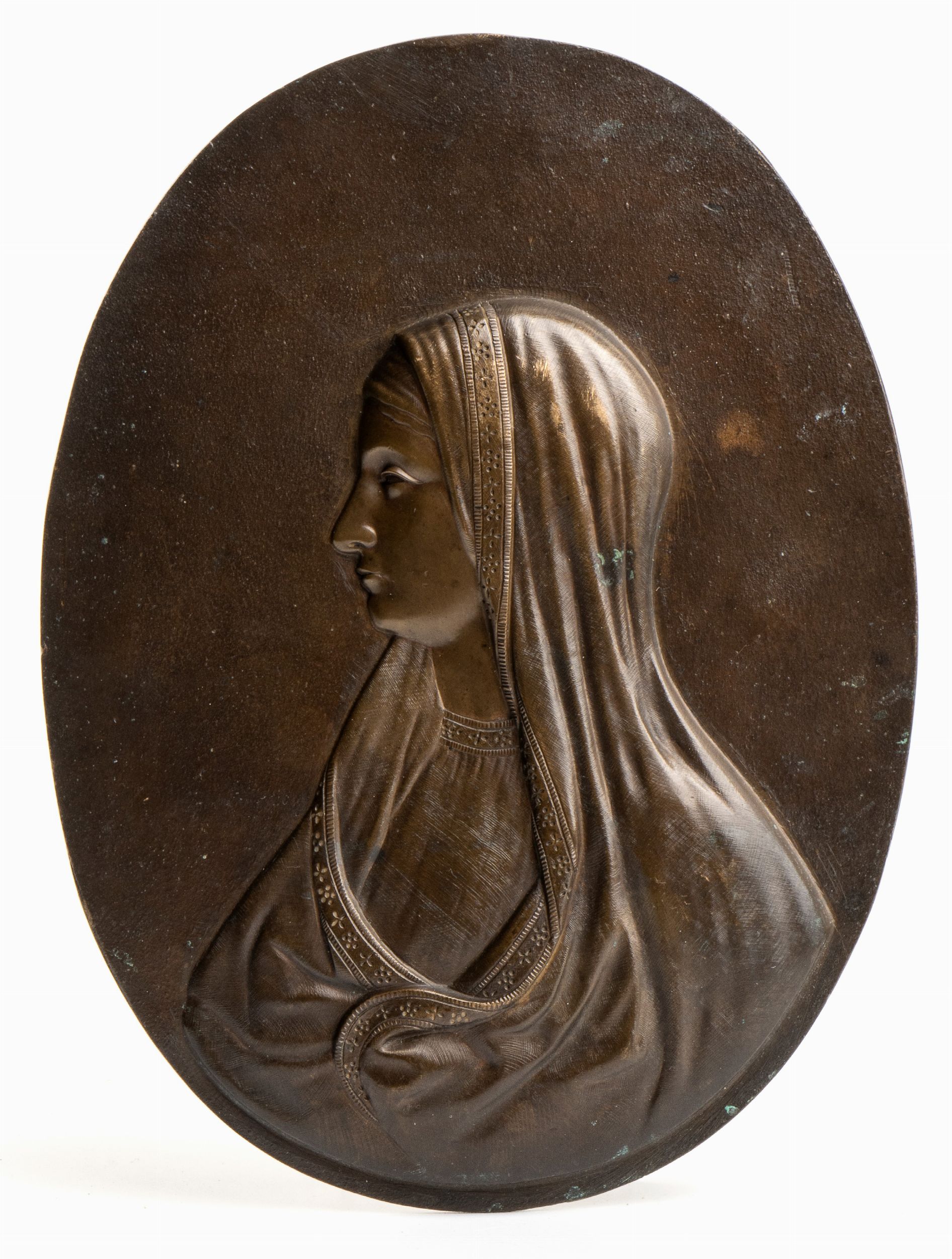 Busto di Maria Vergine verso sinistra ammantata e velata.