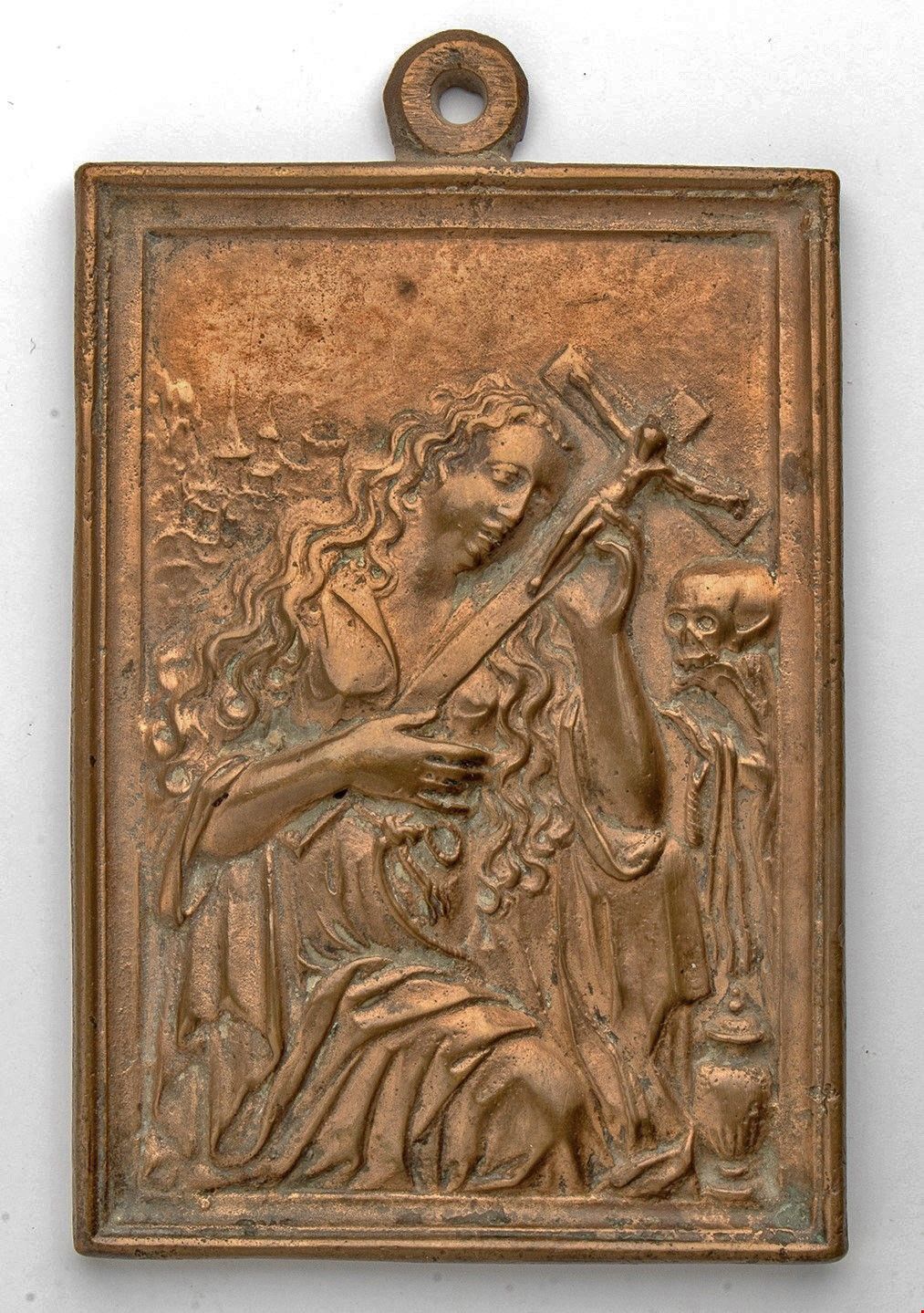 Santa Maria Maddalena inginocchiata tiene un crocifisso tra le mani; sulla destra, un teschio e un pisside; sullo sfondo, veduta di una città . Cornice modanata, con anello di sospensione. Bella fusione coeva.