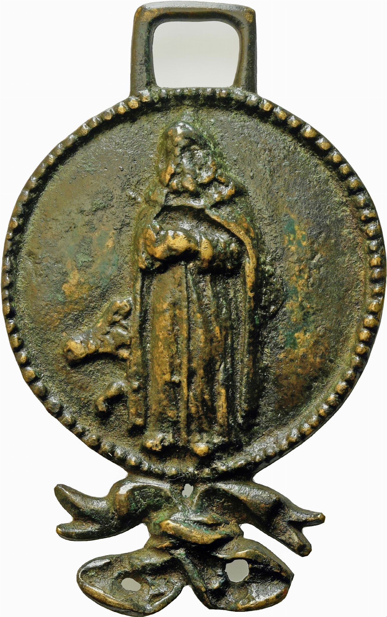 San'Antonio stante con cappuccio, dietro il profilo di una testa di maiale, fondo liscio, contorno a globetti in esergo drappo. Bella fusione originale.