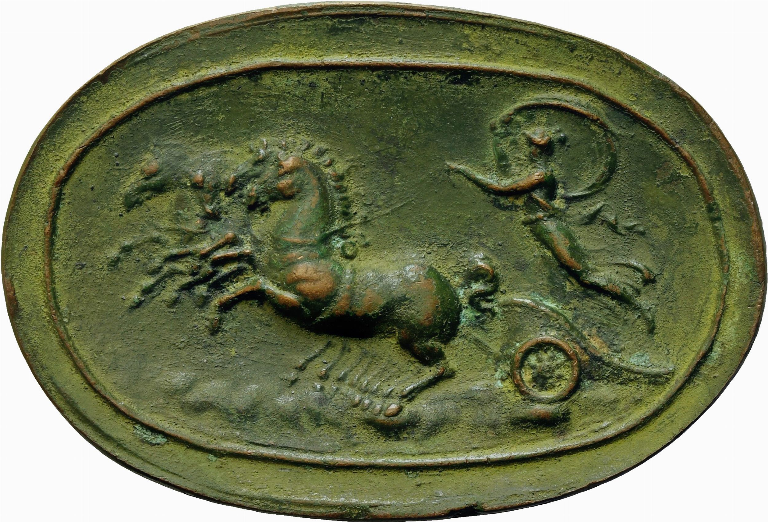 Figura femminile (Venere?) su biga trainata da quattro cavalli, al galoppo verso sinistra. Contorno lineare. Fusione tarda.