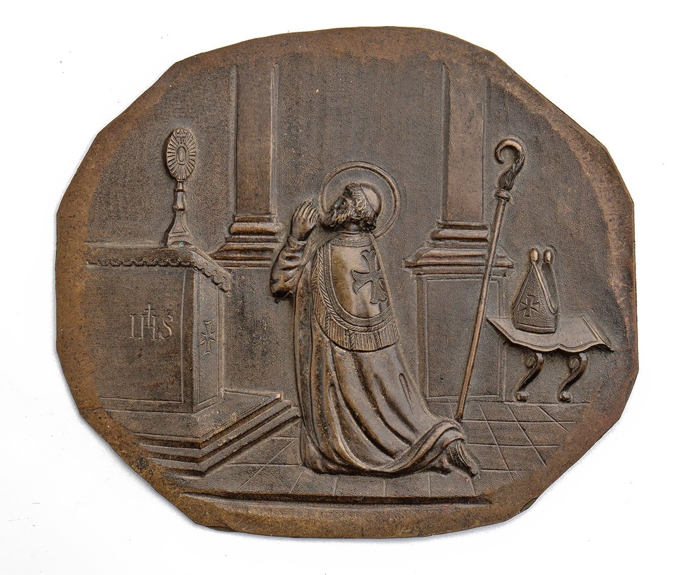 AE Fusione 72,5 x 63,1. Bella qualità , patina marrone Vescovo in preghiera davanti ad un ostensorio