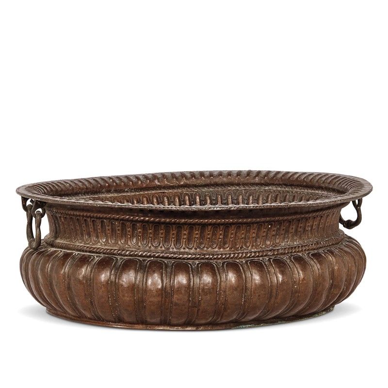 in rame sbalzato di forma ovale con due prese in bronzo ai lati; corpo scandito da ampie baccellature, orlo estroflesso e alto collo decorati da motivo a unghiatura entro profili a nastro, cm 21x61x51,5