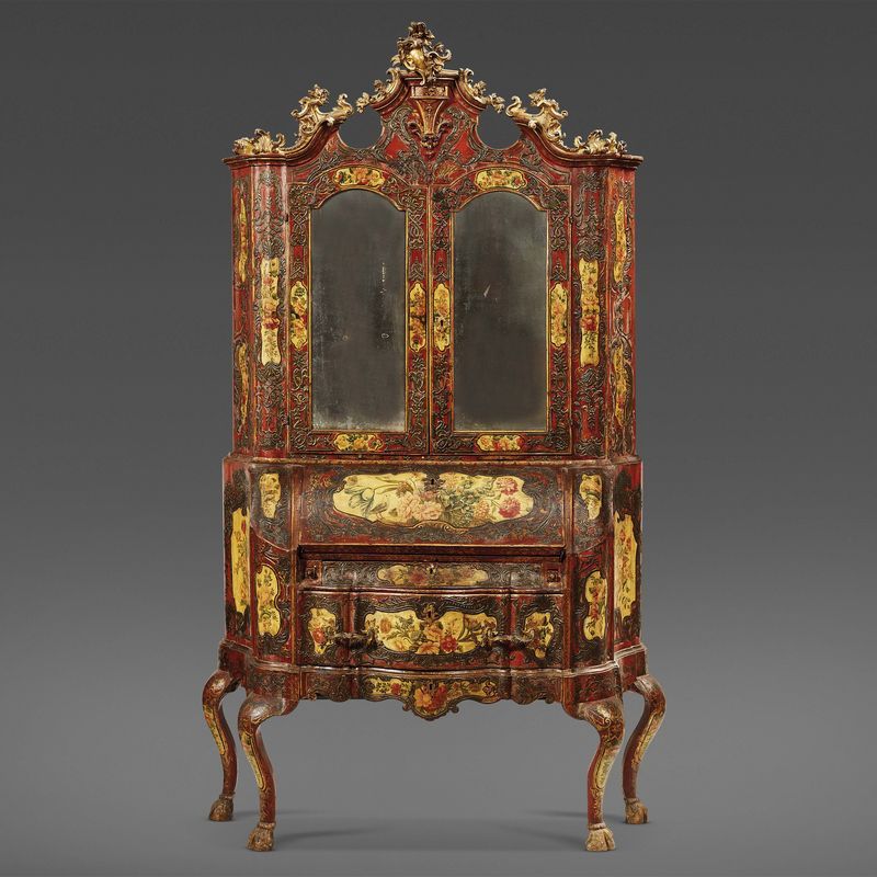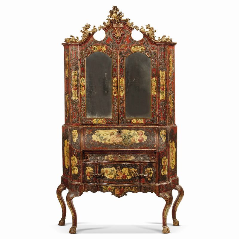 in legno laccato e dorato con rilievi a pastiglia, fronte e fianchi di linea mossa, cimasa intagliata con intagli vegetali dorati e stemma entro cartouche ad impreziosirla, doppio sportello con specchi a celare ricco interno composto da una serie di vani di varie forme e dimensioni, sorretti da colonnine ebanizzate e dorate ed intaglio di forma ondulata a simulare un tendaggio nella parte superiore. Il mobile, anche al suo interno, è interamente laccato sui toni del rosso e del giallo con particolari dorati, e ornato da decorazione a motivi floreali e, all'interno delle ante, dai tipici vasi di fiori entro riserve. Il piano a ribalta nasconde invece una serie di vani e cassetti di forma, dimensione e intaglio diversi, due tiretti ed ulteriori tre cassetti sottostanti, di cui l’ultimo, di linea sagomata, prosegue su fascia sorretta da quattro gambe arcuate, cm 240x145x58