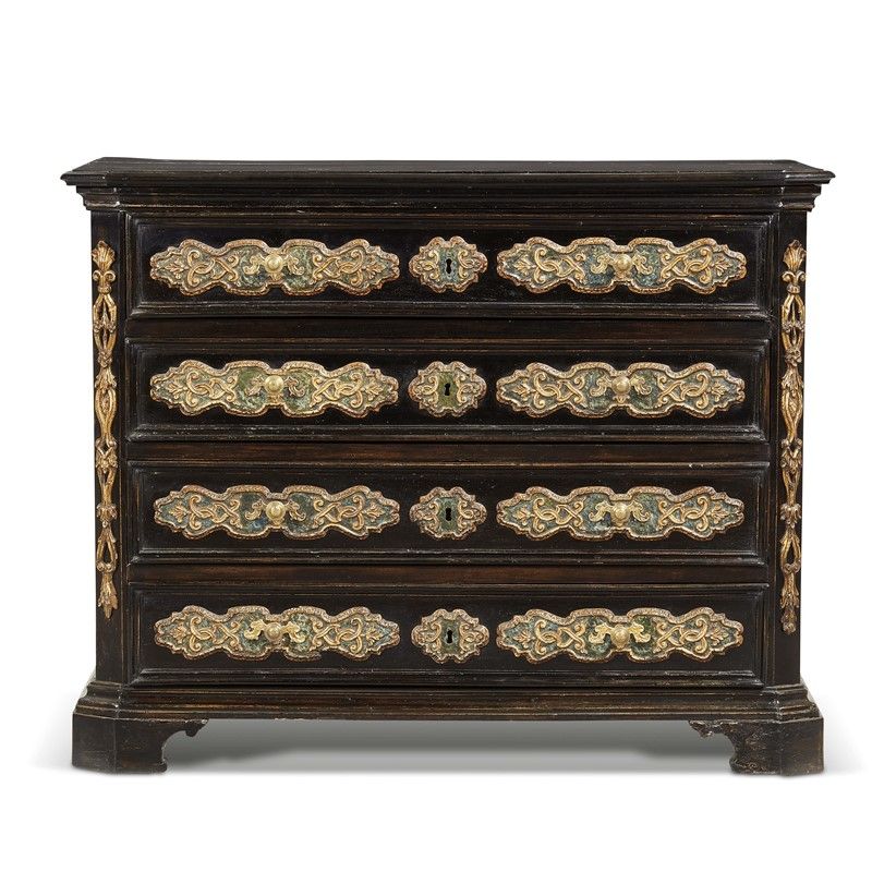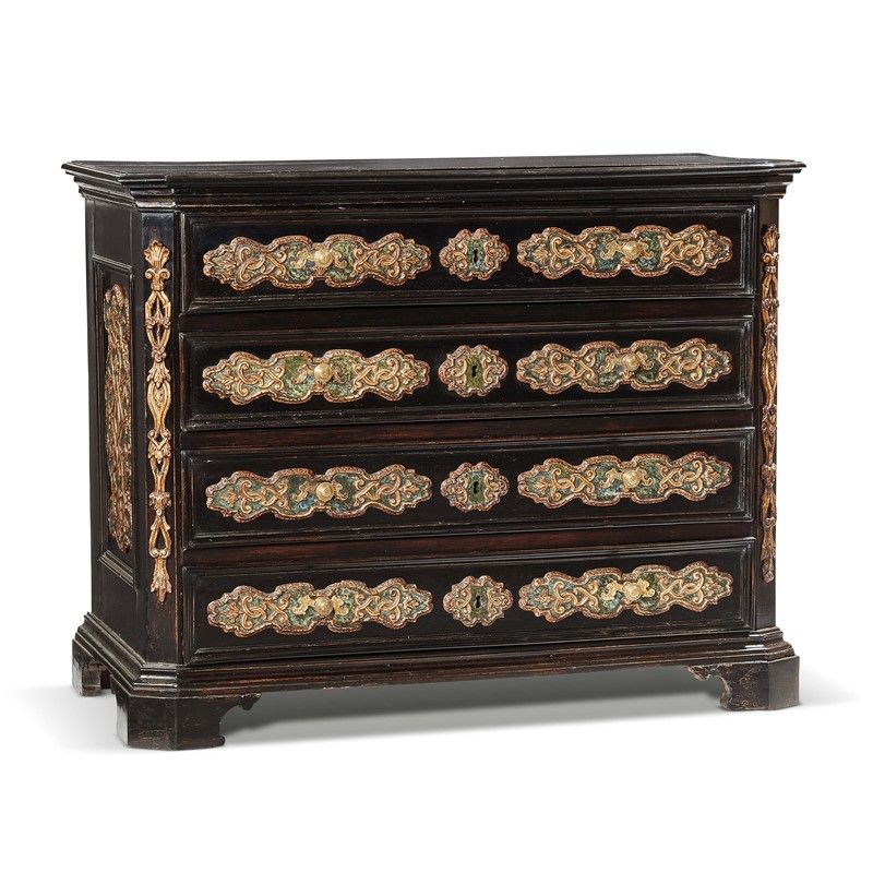 CANTERANO, LOMBARDIA, FINE SECOLO XVII in legno ebanizzato, piano aggettante e fronte a quattro cassetti impreziositi da rilievi dipinti ad imitare il marmo e dorati che si sviluppano orizzontalmente e si ripetono analoghi nella decorazione dei fianchi; lesene scantonate impreziosite da fregi dorati a rilievo, base modanata su piedi a mensola, cm 140x110x65
