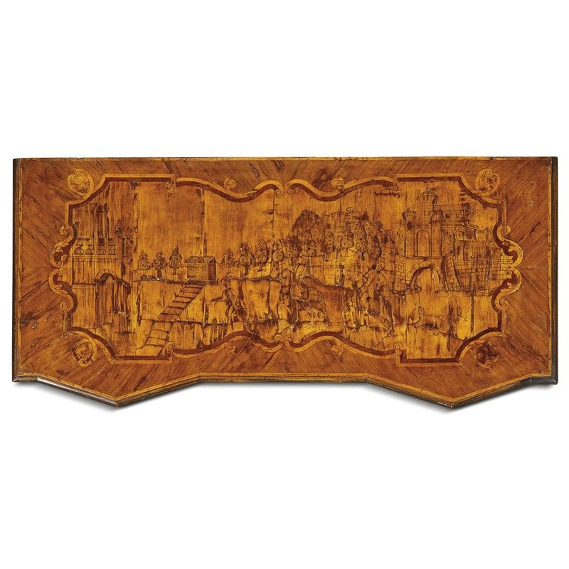 in legno filettato e intarsiato in radica, fronte a quattro cassetti con profili ebanizzati, piano leggermente aggettante e dal profilo ebanizzato decorato a raffigurare una scena di paesaggio (un uomo e due cavalieri che in sella al cavallo escono da un castello, attraversando il bosco, per dirigersi verso un palazzo) entro cartouche; fianchi anch'essi decorati con riserve contenenti scene galanti, inquadrate da architetture con un suonatore nel lato sinistro e un arlecchino nel lato destro, cm 109x173x75