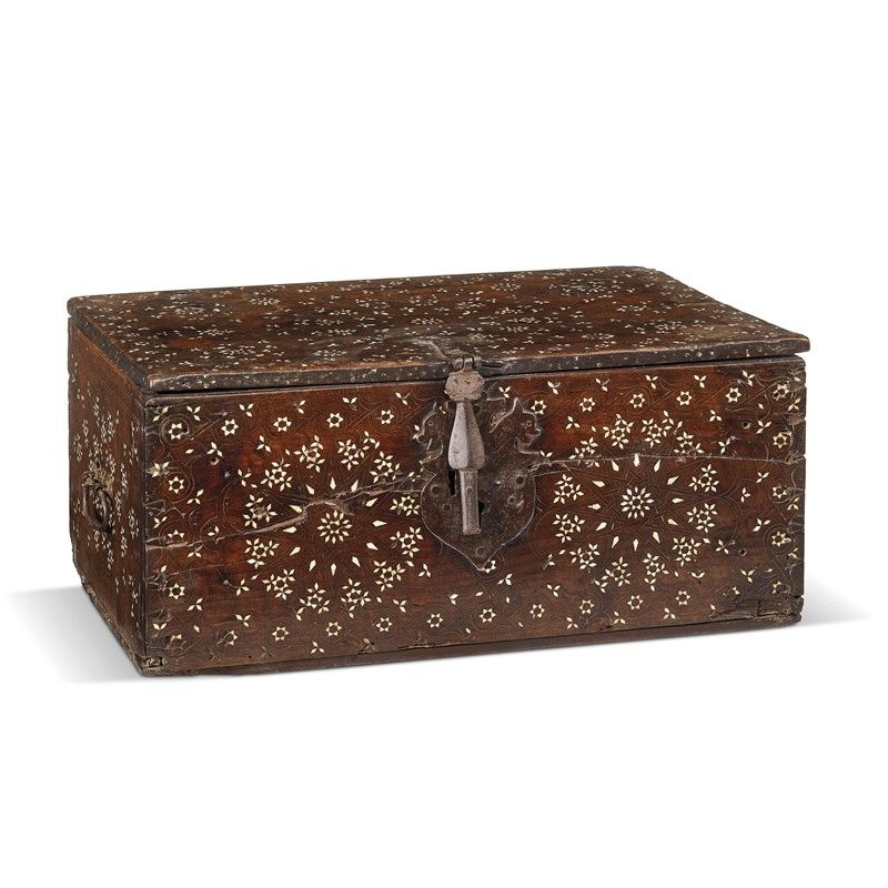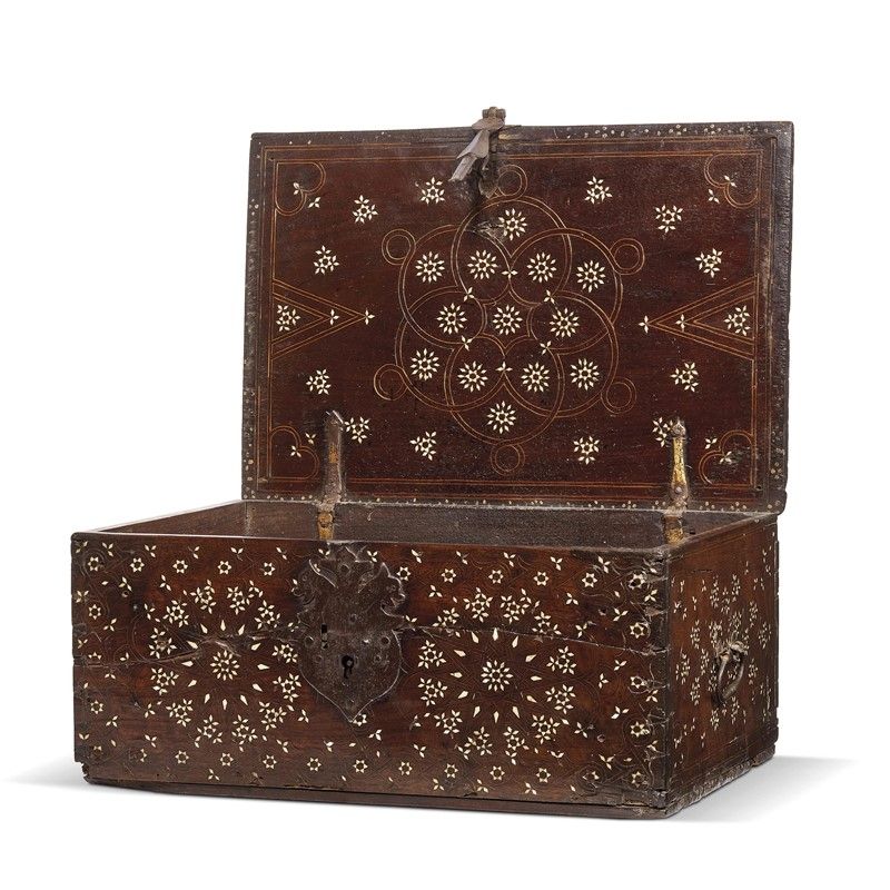 in legno filettato e intarsi alla certosina in osso in stile arabeggiante, con fiori stilizzati talvolta disposti con andamento circolare sulla parete frontale e all'interno del coperchio; serratura in ferro battuto a forma di cuore sovrastato da due profili animali, cm 23x51x35