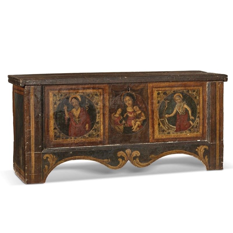 CASSONE, TOSCANA, INIZI SECOLO XVII in legno dipinto in policromia, sul fronte è raffigurata la Madonna col Bambino e San Giovannino entro riserva circolare affiancata dalle immagii di San Giovanni Battista e San Girolamo entro cornici quadrangolari; grembiale di linea mossa profilato da volute e motivi fogliacei, cm 76,5x164x55