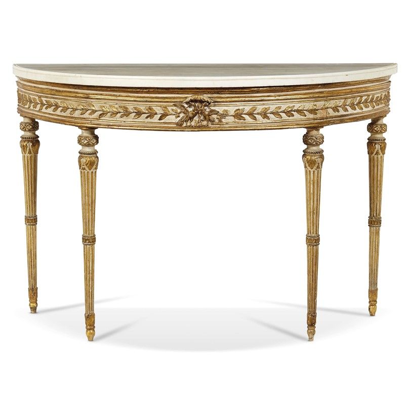 CONSOLE, NAPOLI, SECONDA METÀ SECOLO XVIII in legno intagliato e laccato, piano in marmo bianco di forma a demi-lune; decorazione a fogliette ricorrenti sulla fascia che si unisce al centro a incorniciare due cigni dorati, sorretto da quattro sottili gambe troncoconiche scanalate, cm 93x140x58