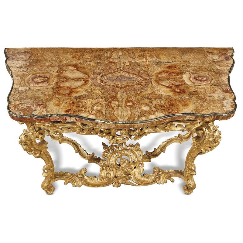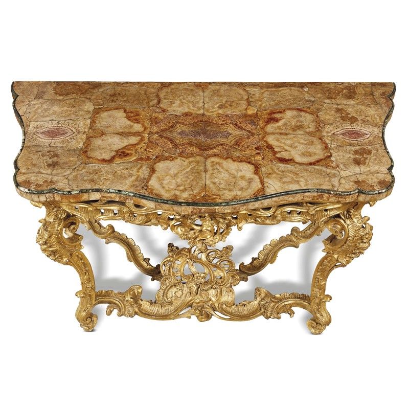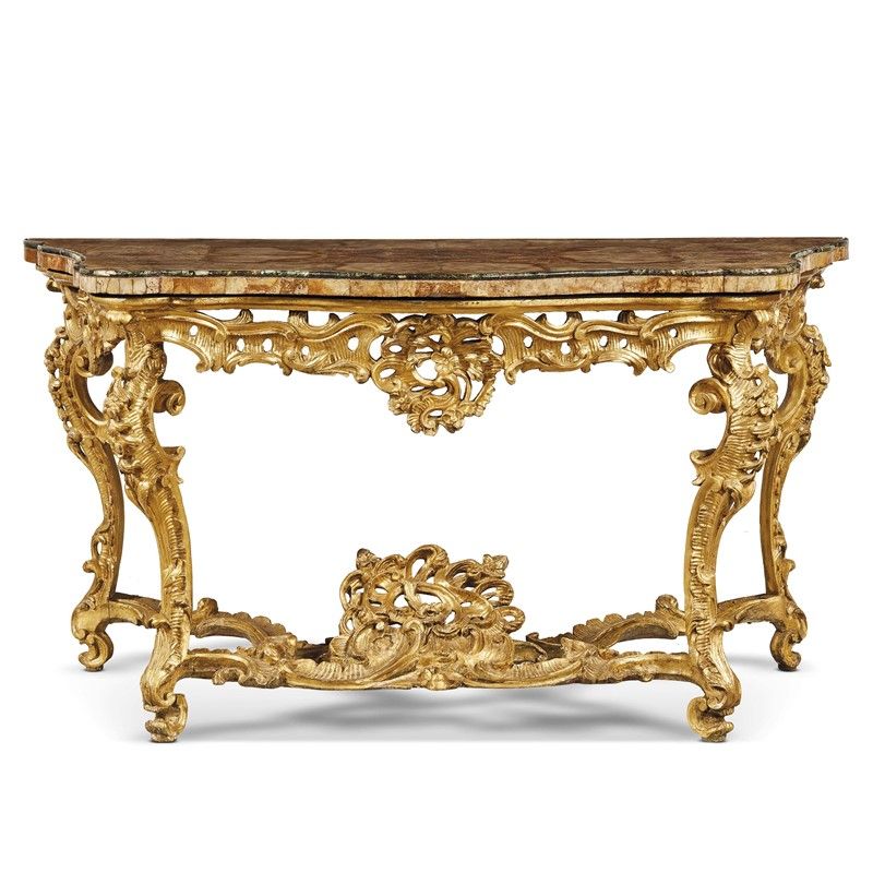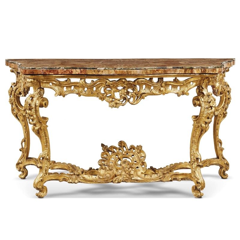 in legno intagliato e dorato, piano lastronato in marmo sotteso da fascia riccamente intagliata a giorno ad intagli vegetali e fiorellini, sostenuta da quattro gambe di linea mossa raccordate da traversa a crociera al cui centro si sviluppa un intaglio rocaille impreziosito da fiori, cm 96x180x89