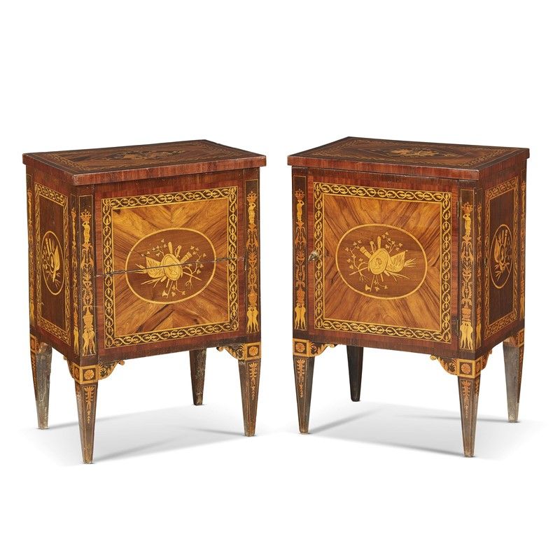 lastronati in legni vari, uno a due cassetti, l’altro con sportello sul fronte e piano apribile, sia il fronte che i fianchi presentano decoro musicale entro lunetta ovale, racchiusi da cornice a racemi intrecciati su fondo lastronato, lesene angolari intarsiate a candelabra, poggianti su gambe troncopiramidali, cm 79x55,5x40
