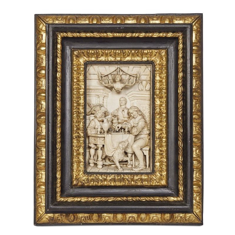 in avorio entro cornici in legno raffiguranti due scene d'interno minuziosamente scolpite raffiguranti Giocatori di scacchi e Giocatori di carte, cm 14,6x8,9, entro cornice in legno intagliato e dorato, cm 29,5x23,5