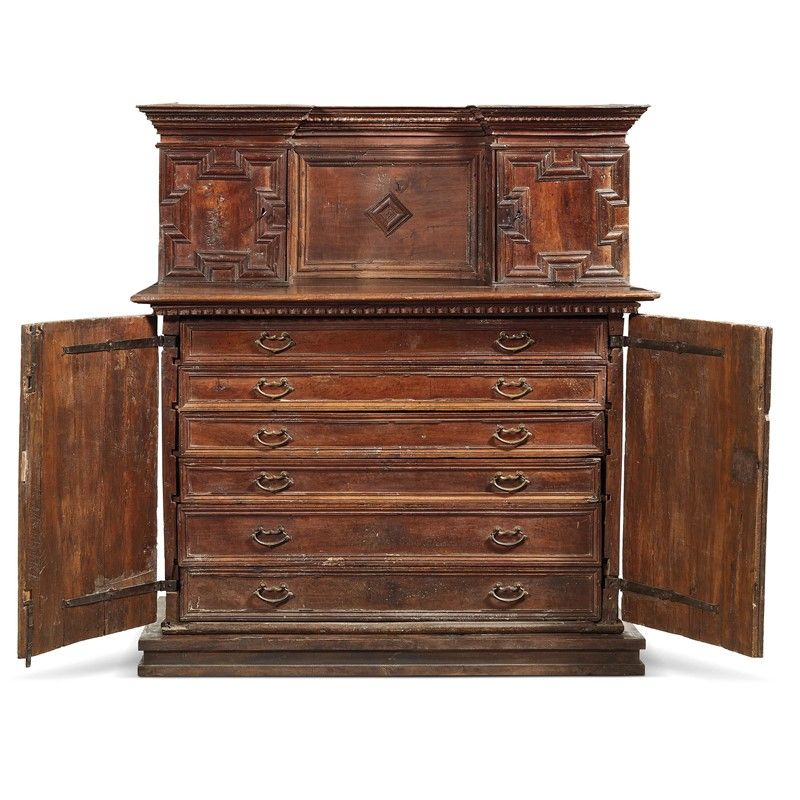 CREDENZA DA SACRESTIA, ITALIA SETTENTRIONALE, SECOLO XVII in legno intagliato, il corpo superiore composto da due sportelli laterali e vano centrale sformellati e chiusi in alto da cornice dentellata, il corpo inferiore con due grandi ante al cui interno si trovano sei cassetti, poggiante su pedana non pertinente, cm 170x148x90