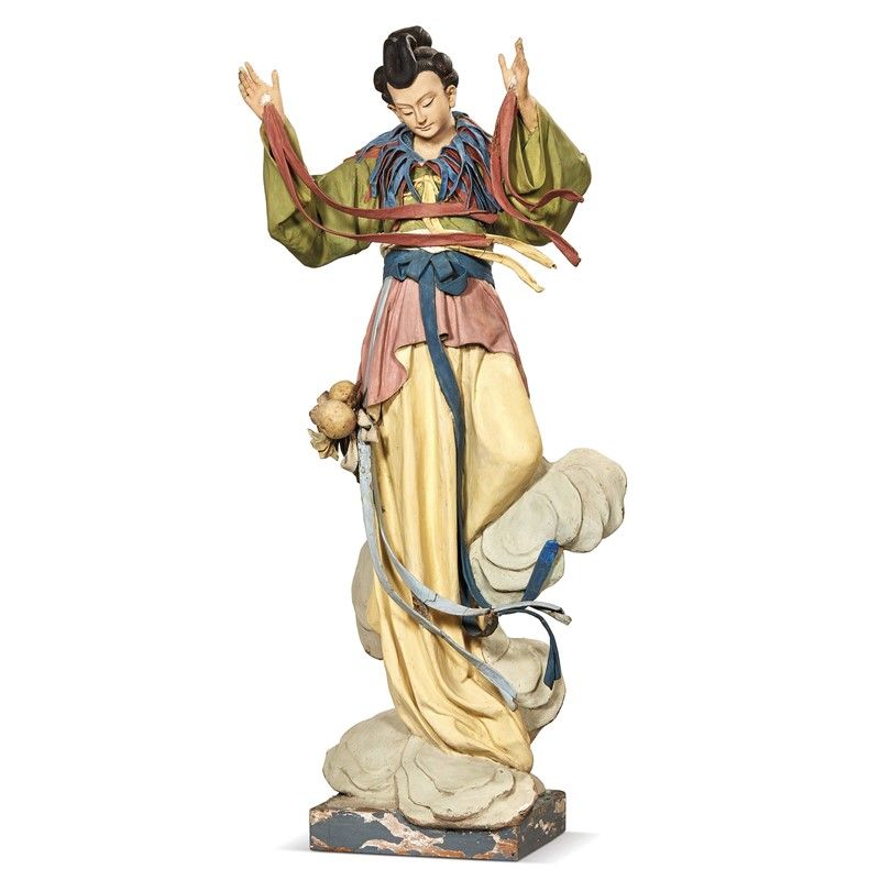 GRANDE SCULTURA, PIEMONTE, FINE SECOLO XVIII in legno e cartapesta dipinti in palicromia su base quadrangolare, modellata a figura femminile orientale stante con le braccia alzate al cielo e nastri svolazzanti. Sul retro etichetta di proveneinza della Galleria Pietro Accorsi di Torino; alt. cm 177