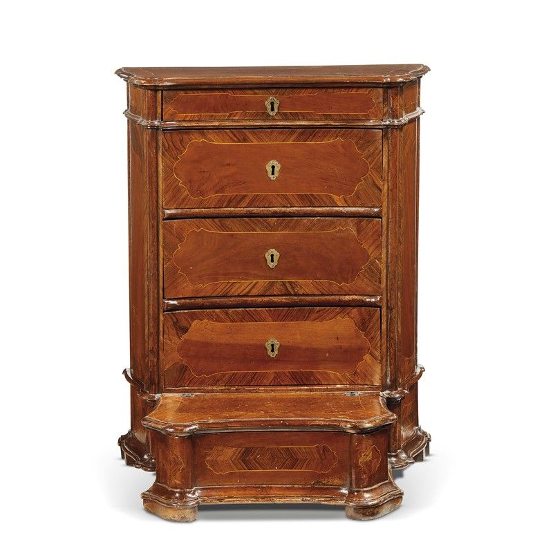 in legno lastronato e filettato, fronte di linea mossa con quattro cassetti, di cui il primo più sottile nel sottofascia, base con pedana dal piano apribile, cm 88x72x54