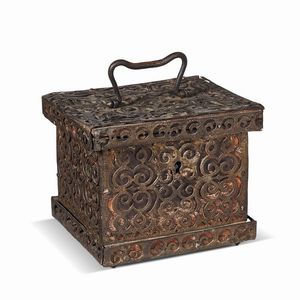 BAULETTO, FRANCIA, SECOLO XVI in ferro battuto, corpo rettangolare a forma di bauletto con coperchio arcuato, [..]