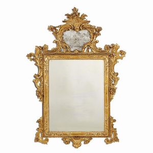 SPECCHIERA, VENEZIA, METÀ SECOLO XVIII in legno intagliato e dorato, cimasa sormontata da grande foglia [..]