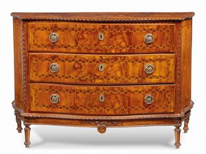 COMMODE, PIEMONTE, FINE SECOLO XVIII lastronato in legni vari con piano in marmo grigio, a démi-lune, lastronata [..]