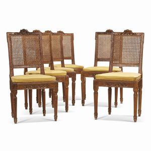 SEI SEDIE, PIEMONTE, SECONDA METÀ SECOLO XVIII in legno intagliato, schienale di forma quadrangolare centrata [..]