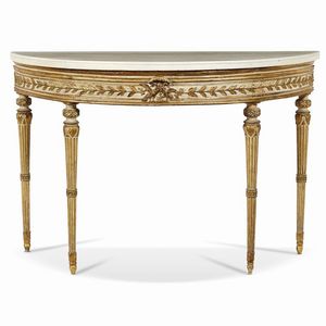 CONSOLE, NAPOLI, SECONDA METÀ SECOLO XVIII in legno intagliato e laccato, piano in marmo bianco di forma [..]