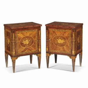 COPPIA DI MOBILETTI, ITALIA SETTENTRIONALE, FINE SECOLO XVIII lastronati in legni vari, uno a due cassetti, l’altro [..]