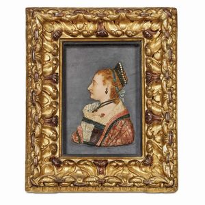 PROFILO DI DONNA, GERMANIA, SECOLO XIX in cera policroma su ardesia raffigurante un profilo di donna che indossa [..]