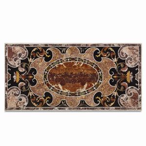 PIANO DI TAVOLO, ROMA, 1590-1600 CIRCA in marmo bianco intarsiato in pietre policrome; cm 61,8x126. Montato ad [..]