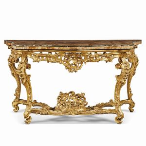 COPPIA DI GRANDI CONSOLES, ROMA, METÀ SECOLO XVIII in legno intagliato e dorato, piano lastronato in marmo [..]