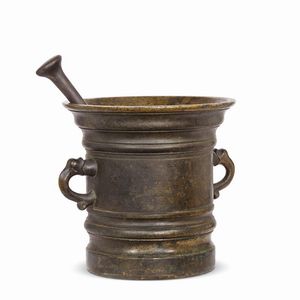 GRANDE MORTAIO CON PESTELLO, ITALIA CENTRALE, SECOLO XVII in bronzo, corpo cilindrico percorso da più fasce [..]