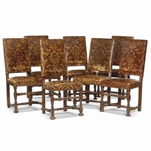 SEI SEDIE, ITALIA CENTRALE, INIZI SECOLO XVII in noce, gambe tornite a rocchetto riunite da traverse anch'esse [..]