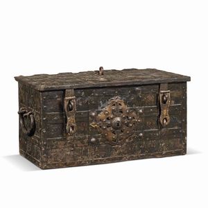 BAULETTO, FRANCIA, SECOLO XVI in ferro battuto, corpo rettangolare a forma di bauletto con coperchio arcuato, [..]