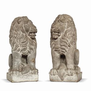 COPPIA DI LEONI, ITALIA CENTRALE, SECOLO XV in pietra scolpita, raffigurati seduti sulle zampe posteriori mentre [..]