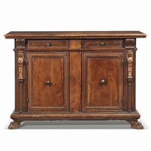 CREDENZA, FIRENZE, INIZI SECOLO XVII in noce intagliato, piano aggettante scende in più modanature su fascia [..]