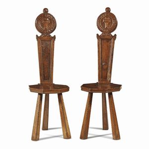 COPPIA DI SGABELLI STEMMATI, FIRENZE, SECOLO XIX in noce intagliato, schienale trapeziodale sformellato sormontato [..]