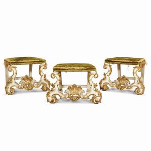 TRE PANCHETTI, ITALIA CENTRALE, INIZI SECOLO XVIII in legno intagliato, laccato e parzialmente dorato, seduta [..]