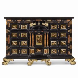 STIPO, FIRENZE, 1700 CIRCA in ebano e pietre dure con applicazioni in bronzo dorato. Fronte di linea spezzata [..]